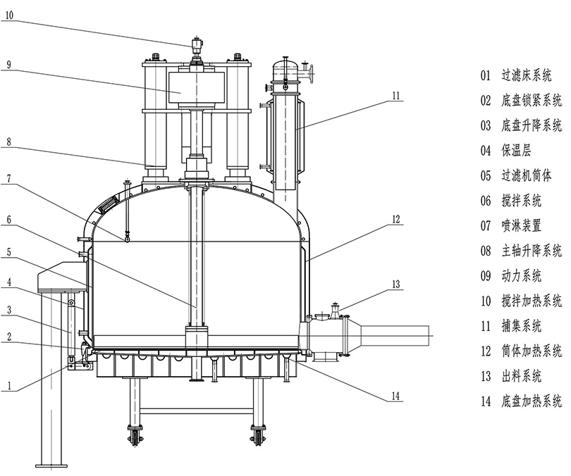该设备由不锈钢制立式容器、搅拌装置、轴端密封装置、升降机构、液压缸、底盘、加热装置、传动机构、滤板、卸料装置、取样装置、支架、控制系统等部件组成,实现机电-体化。