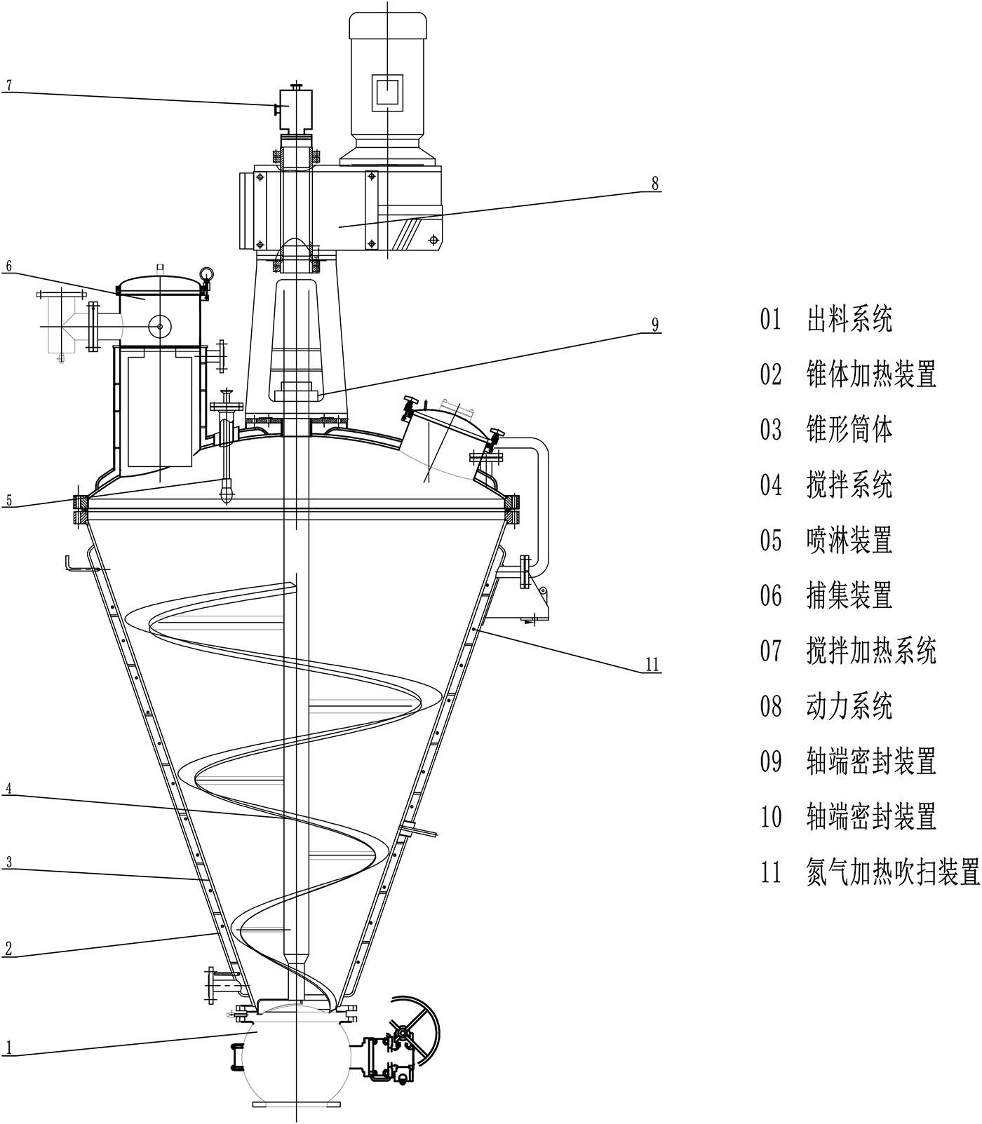 3、干燥效率高:有效传热面积大,是容器内面积1.4倍;物料在器内呈螺旋提升,再沿主轴呈涡流下降,在分散运动中均匀有效受热;机头高真空与机底同温高速脉冲气流同向结合,有效带走物料的溶剂;双通道真空管口,防止真空堵塞,降低阻力,提高抽气速率,带反吹的捕集器,能有效提供高真空。